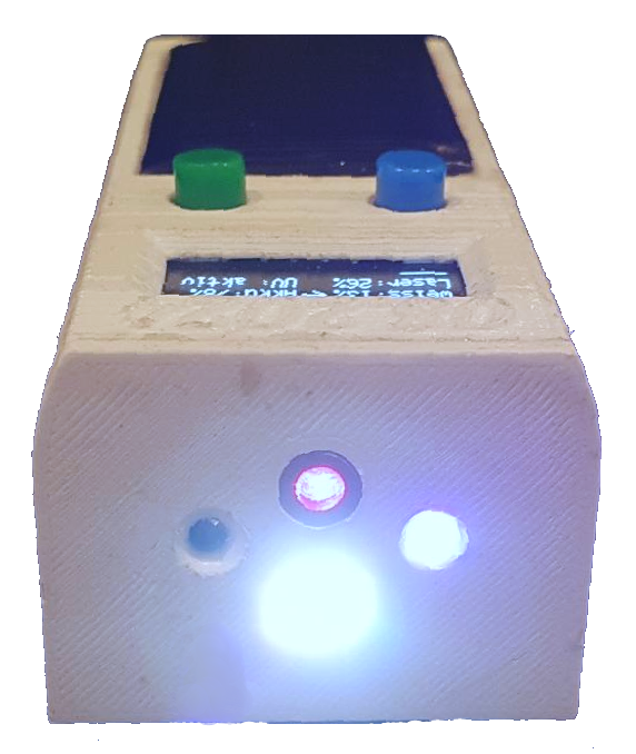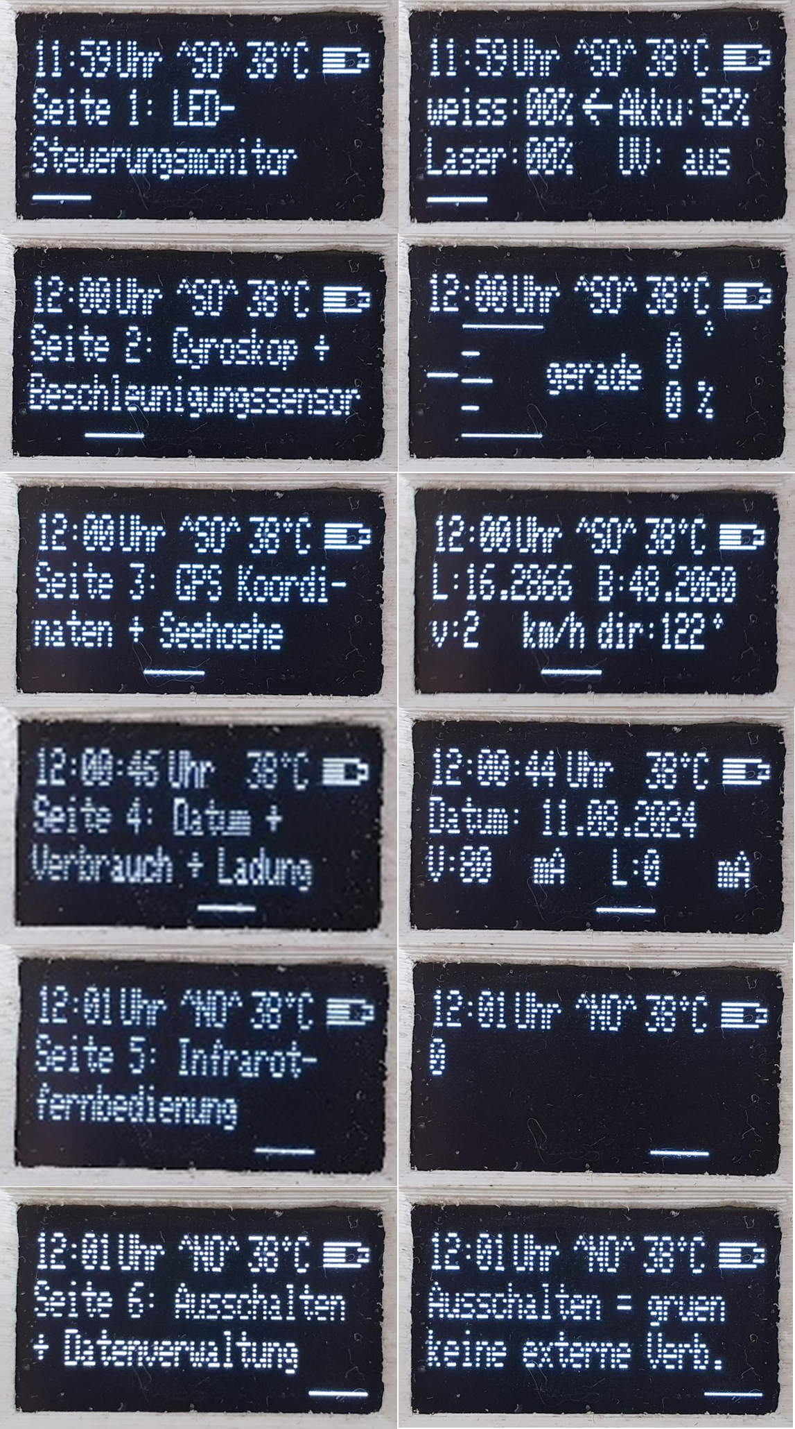 1) Hauptbildschirm: In diesem Menü ist die Steuerung der LEDs möglich. Mithilfe des blauen Tasters lässt sich die LED auswählen und durch drücken des grünen Tasters in Kombination mit einer Schwenkbewegung um die längere Achse lässt sich die Helligkeit in 1% Schritten von 0-100% einstellen. Auf jedem Bildschirm ist in der obersten Zeile die aktuelle Uhrzeit, Temperatur und Akkustand ablesbar. 2) Gyroskop und Beschleunigungssensor: Alle Daten des Gyroskops und Beschleunigungssensor sind auf diesem Bildschirm dargestellt. Durch kurzes drücken auf den blauen Taster kann auf eine "Waage" Anzeige umgeschaltet werden. 3) GPS Monitor: Am GPS Monitor können Längen und Breitengrad der aktuellen Position abgelesen werden. Zudem erfolgt eine Berechnung der Höhe über dem Meeresspiegel, der aktuellen Geschwindigkeit und der Himmelsrichtung, in die man sich bewegt (Weg > 20m zur Himmelsrichtungsbestimmung). Nach dem Start des Überlebenstools kann es wenige Minuten dauern, bis das GPS Signal ausreichend ist, sodass alle erwähnten Daten angezeigt werden können. Nicht außer Acht zu lassen ist die Tatsache, dass sogar eine "Zuhause" Adresse hinterlegt werden kann und die Richtung inklusive Entfernung nach Hause angezeigt wird. 4) Datum, Stoppuhr, Strom & Spannung: Auf diesem Bildschirm erfolgt primär die Anzeige des aktuellen Tages, des berechneten Verbraucherstromes und des gemessenen Ladestroms. Wird der grüne Taster auf diesem Bildschirm betätigt, startet e#zuerst ein 3 Sekündiger Countdown und danach zählt die Zeit in Sekunden, wie bei einer Stoppuhr hoch. Gestoppt und resettet kann die Stoppuhr ebenfalls über den grünen Taster werden. 5) IR Fernbedienung: Dieser Bildschirm befindet sich zurzeit noch in Entwicklung. Ziel ist es ein IR-Signal einer Fernbedienung auszulesen und dieses wiedergeben zu können. 6) Herunterfahren Menü: Durch Betätigung des grünen Tasters in diesm Bildschirmmenü kann das Überlebenstool heruntergefahren werden. Erkennt das Überlebenstool für mehr als 2 Minuten keine Aktivität von den Tastern oder des Beschleunigungssensors, so schaltet sich das Überlebenstool nach einem 30 Sekunden langem Hinweis über die bevorstehende Abschaltung, automatisch ab. |