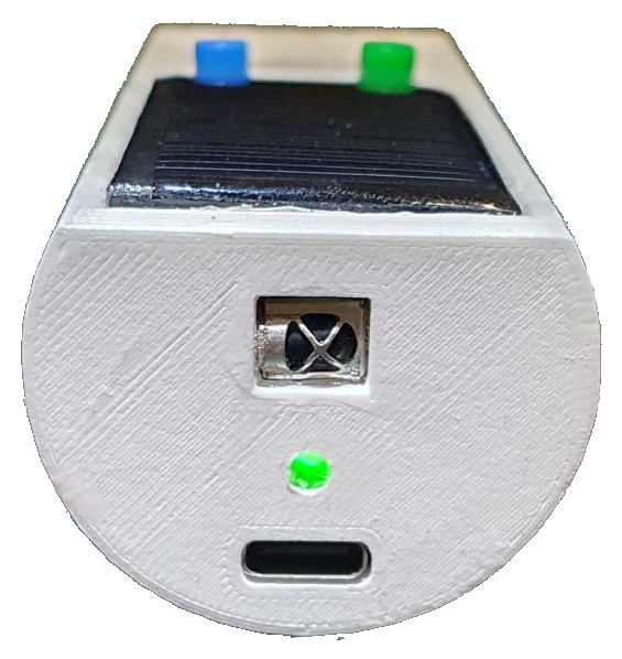 Ladung: Die Ladung erfolgt entweder durch die Solarzelle oder über die USB-C Buchse mit 5V Spannung. Außerdem kann das Arduino zugleich über den USB-C Stecker programmiert werden.